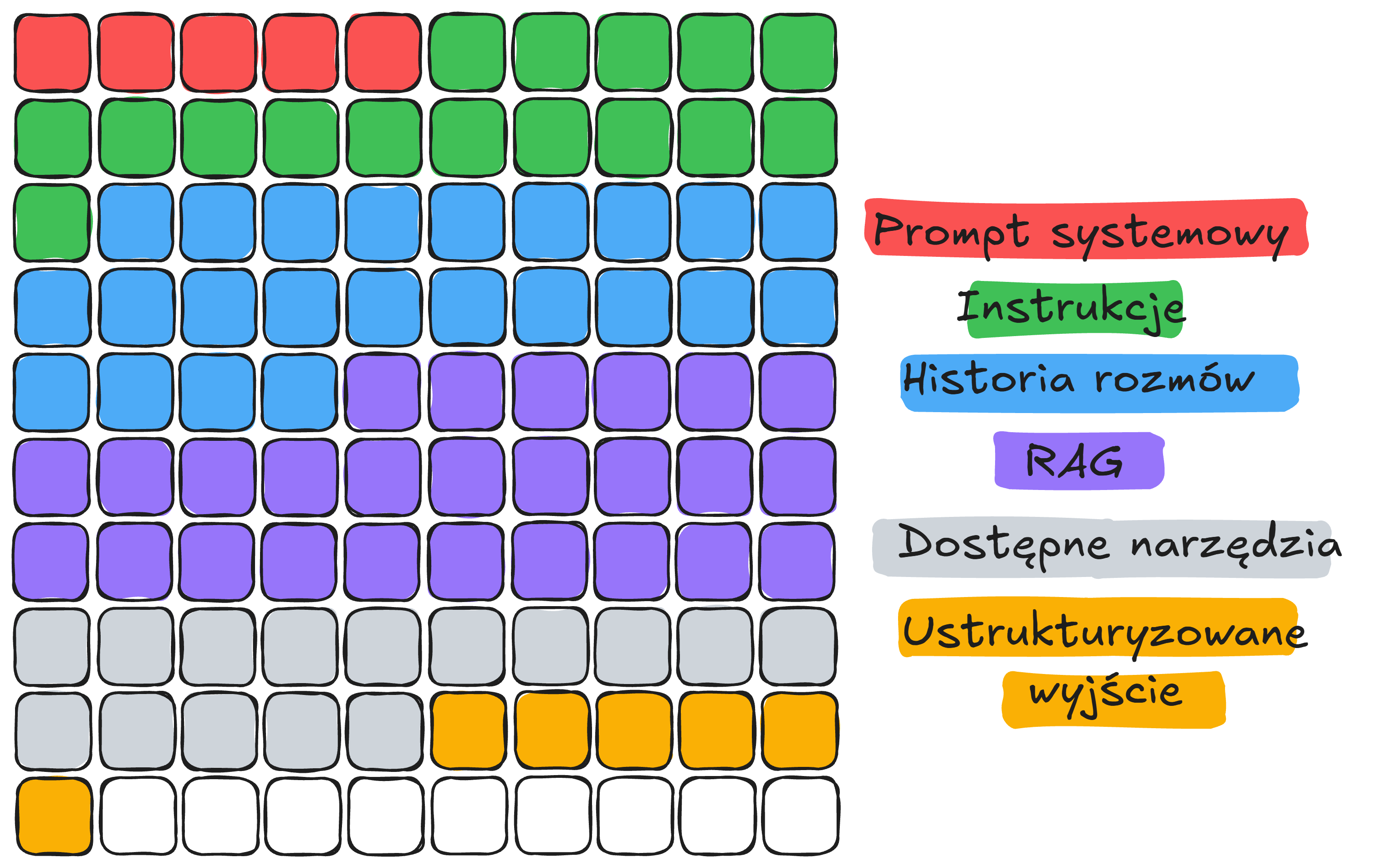 Czym tak właściwie jest kontekst? W zasadzie jest to wszystko, co model „widzi” i na czym opiera swoje decyzje. Począwszy od instrukcji systemowych (system prompt), poprzez bieżącą rozmowę i wcześniejsze interakcje, kończąc na wynikach uzyskiwanych z wykorzystanych narzędzi i zewnętrznych źródeł danych (m.in. dokumentów i baz danych). Kontekst dostarcza LLM-owi wiedzę i informacje, by skutecznie realizować swoje zadania. I jak to w życiu bywa, budowa kontekstu wymaga zachowania balansu – zbyt duża ilość informacji może doprowadzić do przeciążenia LLM-a, natomiast ich brak uniemożliwi mu udzielenie poprawnej odpowiedzi – model po prostu „nie będzie wiedział”.
