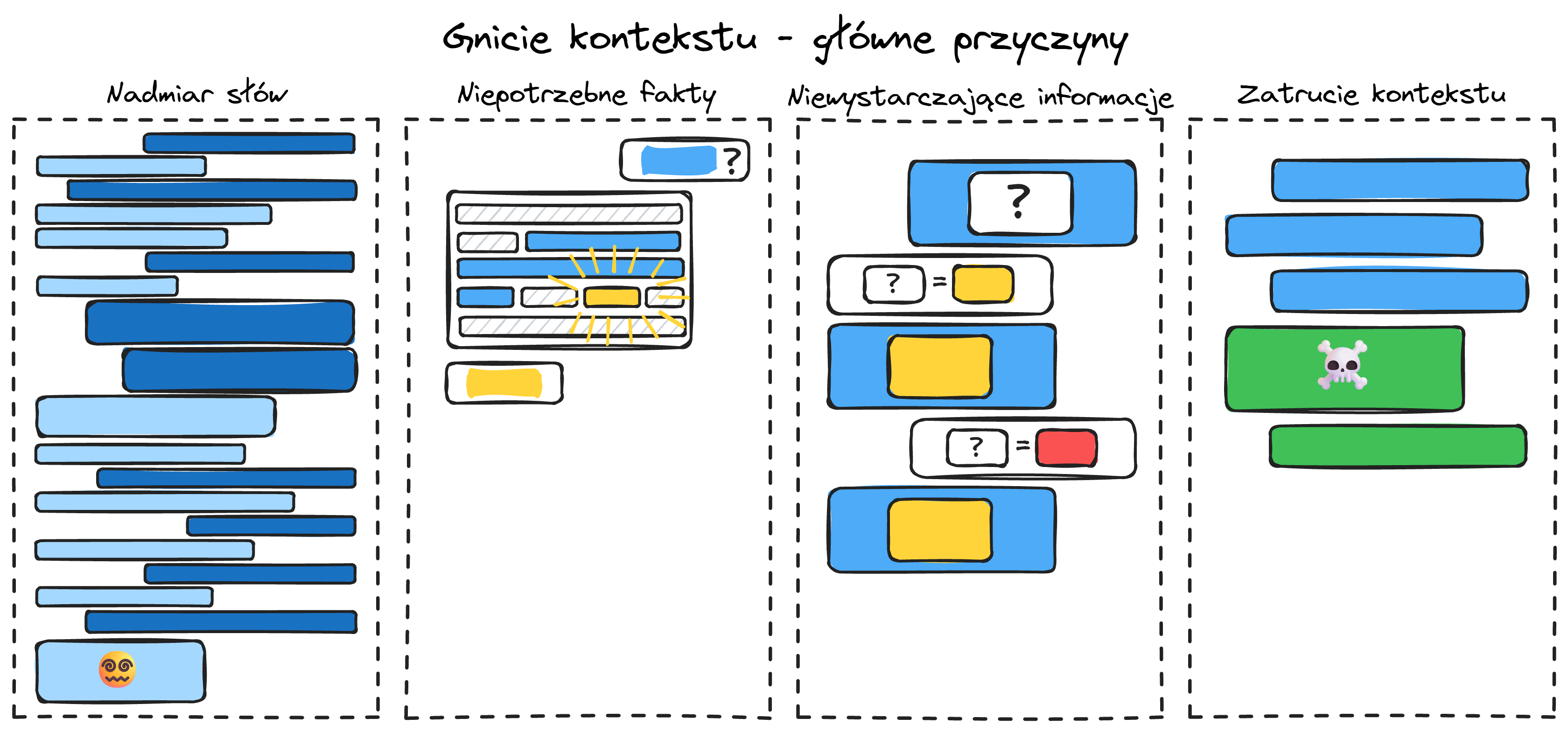 Brak umiaru i nadmiar słów mogą szybko doprowadzić do tzw. gnicia kontekstu – czyli sytuacji, w której rozrastający się kontekst zaczyna sam siebie psuć. Nawet jeśli wszystko mieści się w limicie tokenów, zbyt duży kontekst – pełen dygresji, powtórek i nieistotnych szczegóły – sprawia, że jakość modelu gwałtownie spada. Nawet poprzednio dobrze działający kontekst zaczyna się degradować po pewnym punkcie – to właśnie moment, w którym „gnicie” staje się widoczne.